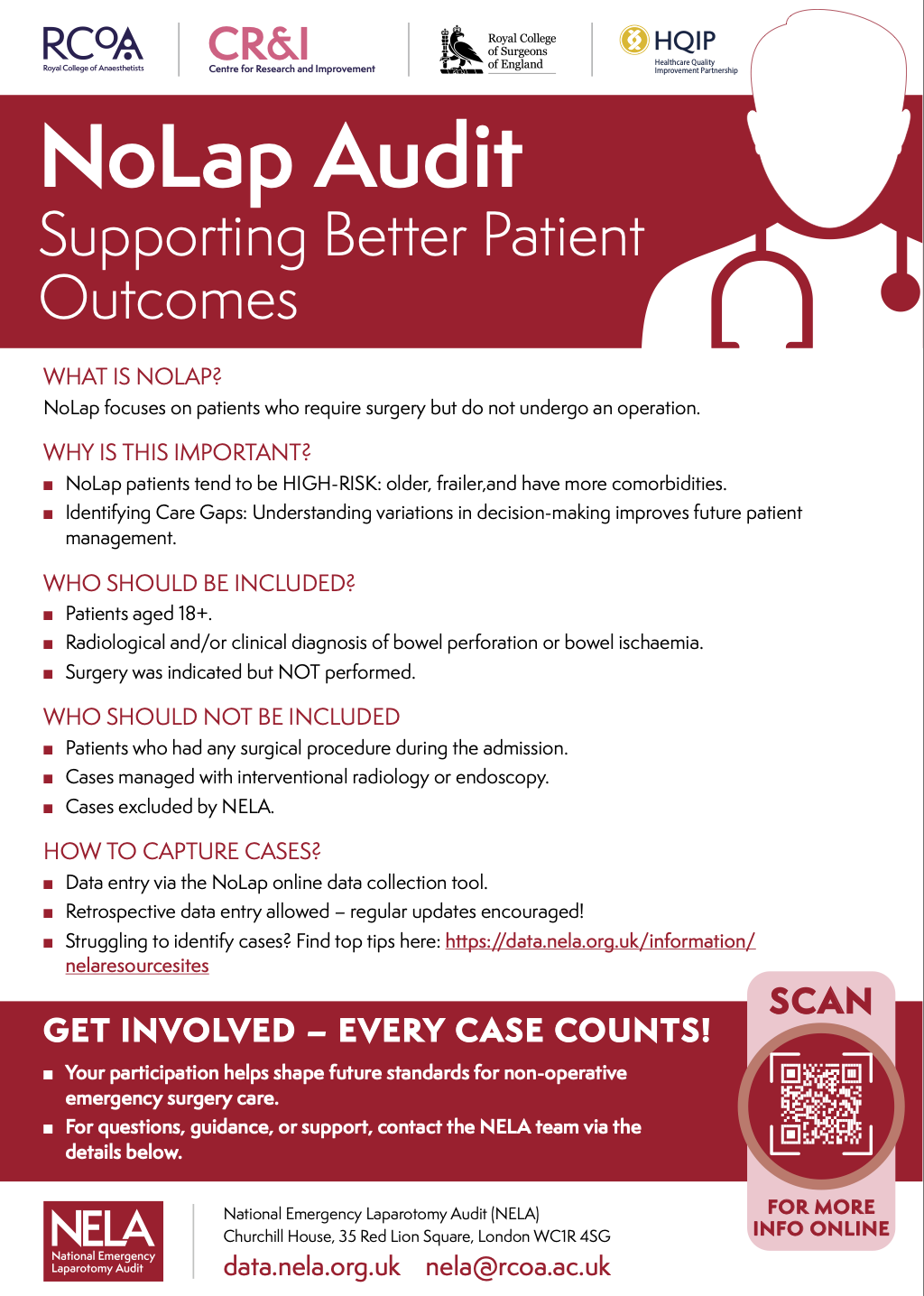 NoLap NELA+ is now commissioned by HQIP to capture data on the NoLap cohort - patients who had an indication for emergency laparotomy but a decision was made not to proceed to surgery. Resources to help sites with this cohort are collated below. NoLap Resources Data Collection and ProcessingInclusion/Exclusion CriteriaAudit ProformasDiagnostic CodesTop TipsStandards of CareCalculations for standards of careFAQ’sMonthly ReportsQI PlanWebinars Publicity/AdvertisingNoLap Poster